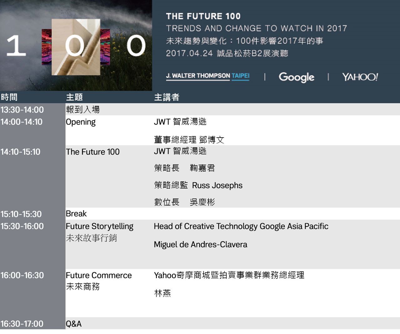 4. 當日將提供J.Walter Thompson 2017 Future 100檔案供下載,惟演講內容之智慧財產權歸演講者所有,請勿以任何方式錄製或轉載於媒體。