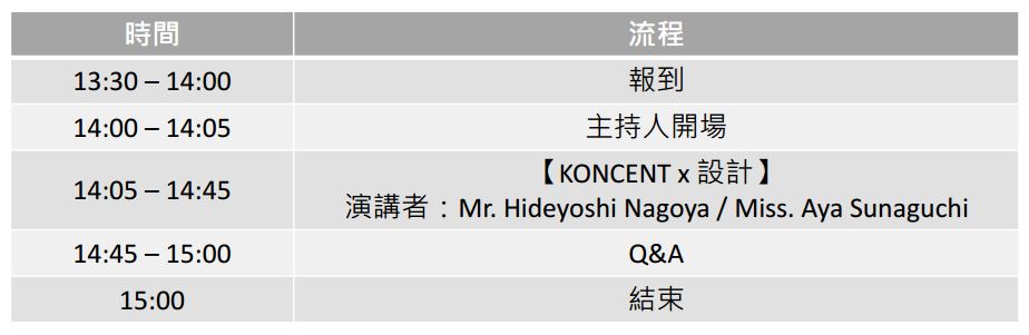 為了串連創意發想者、生產製造者、使用者,創立一個網路平台KONCENT,匯集日本眾多設計師的點子,將點子商品化進而販售,讓更多人接觸體驗生活中的活力,全台首家實體店面就座落於台北民生社區富錦街,11/19榮幸邀請到 h concept 設計總監 Mr. Hideyoshi Nagoya與首席設計師 Mrs. Aya Sunaguchi 兩位來到現場,想知道他們是如何看待設計,如何將創意發想、製造者、使用者串連,創造出不可能的任務,趕緊來參與「KONCENT X 設計」,一同暢談!