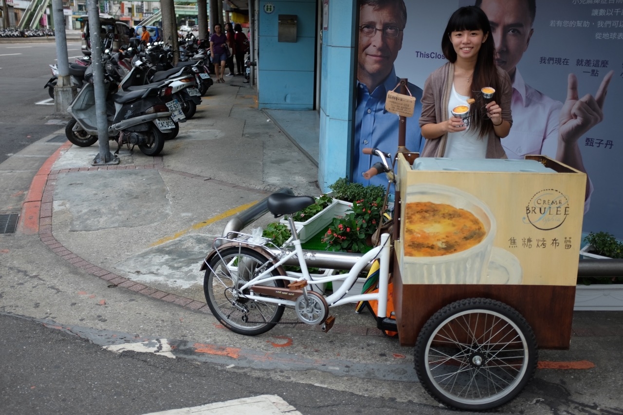 Crème Brûlée 在香脆的薄薄焦糖表面下,埋藏著滑嫩柔順的冰凍燉蛋,一口咬下冷暖交融、在口中編織出浪漫的樂章…這道俗稱法式烤布蕾的美味甜點跟今年剛從大學畢業的索菲有著相同的特質:堅強的外在+柔暖的內在。每週六、日在台北捷運後山埤捷運站周邊,你會在某個角落找到一部擁有法式風情的行動攤車,這位年輕的大女孩正透過自己的雙手,獨立且堅強的完成生產、宣傳、銷售屬於自己的品牌商品:索菲烤布蕾。