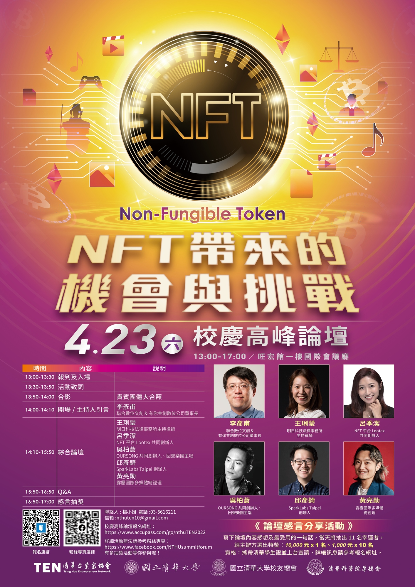 14:10-15:50 | 綜合論壇 | 王琍瑩 明日科技法律事務所主持律師 呂季潔 NFT平台Lootex 共同創辦人 吳柏蒼 OURSONG 共同創辦人、回聲樂團主唱 邱彥錡 SparkLabs Taipei創辦人 黃亮勛 霹靂國際多媒體總經理 |