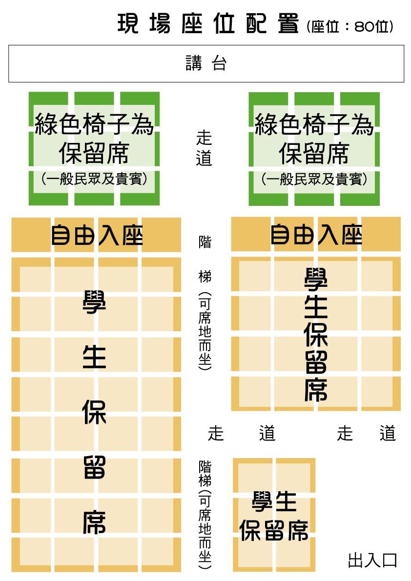 先報到者可先入座,現場座位坐滿可席地而坐,座位配置如下圖,