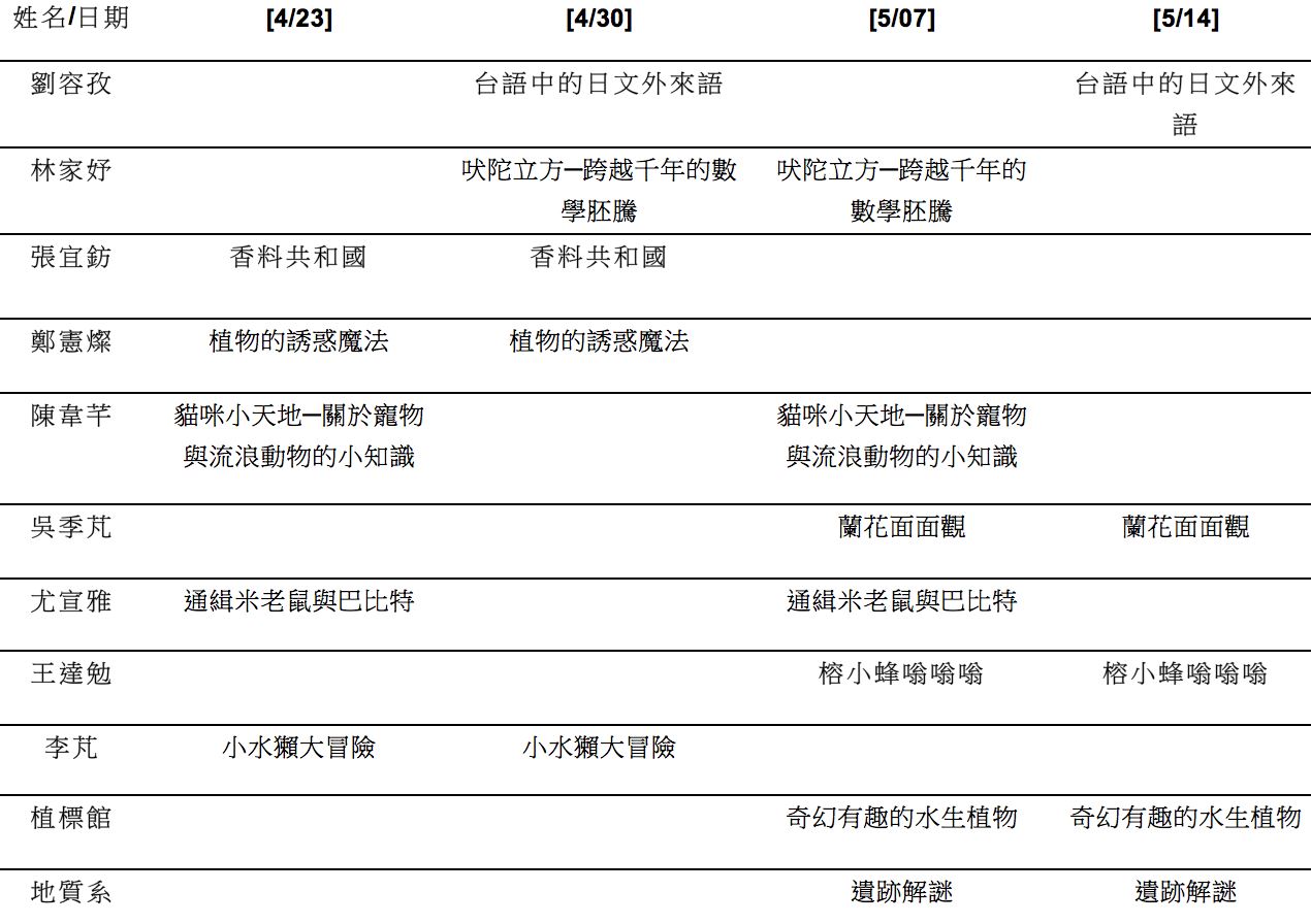 由臺大學生設計並進行解說,藉由圖卡、標本、遊戲及說故事等活動,開心的學習多元的知識與觀念。
