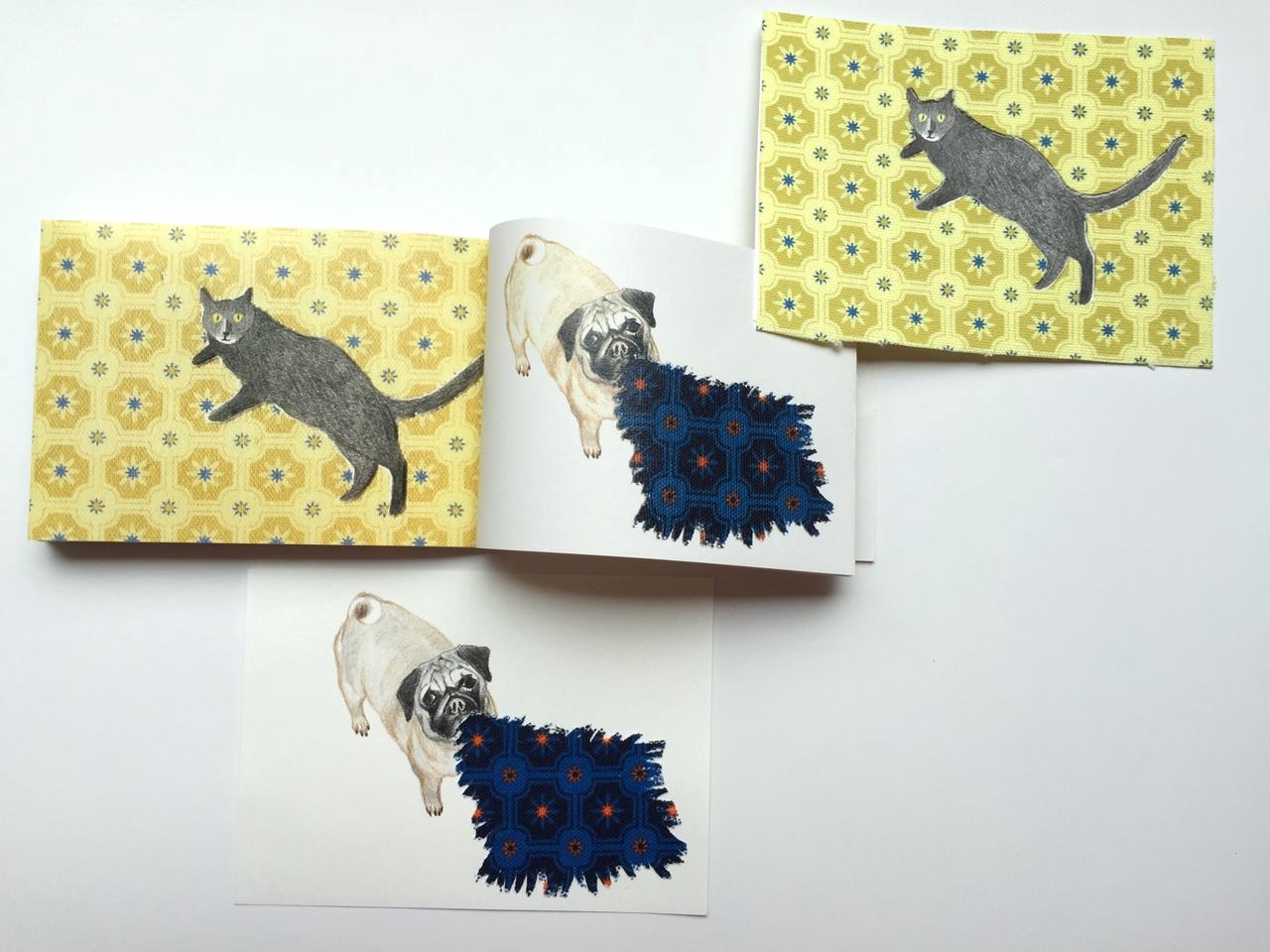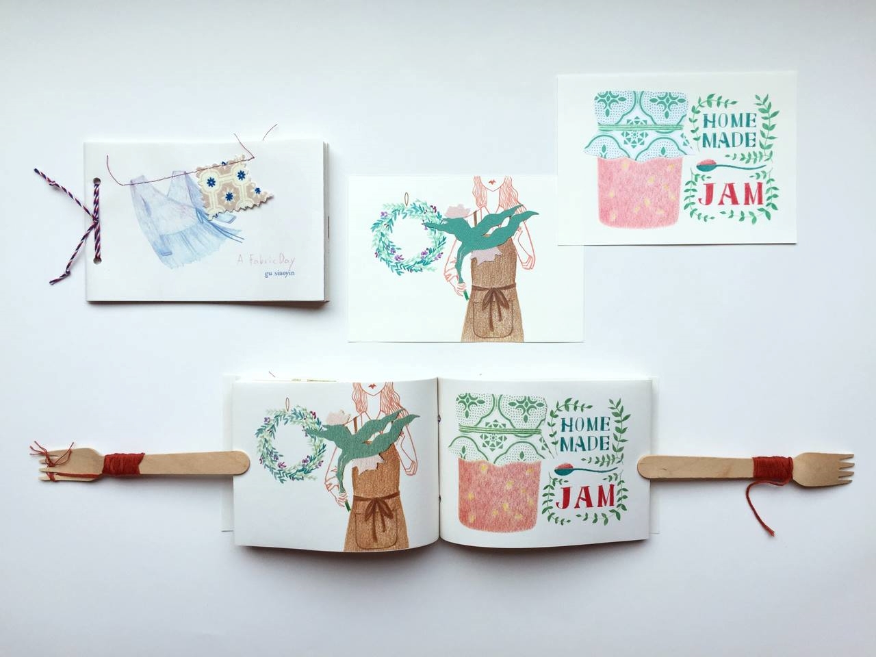 色鉛筆描繪和印花布拼貼,激盪出不一樣的圖像語彙,創作出一張虛實交錯的布繪卡。從單頁製作到裝訂做出一本ZINE