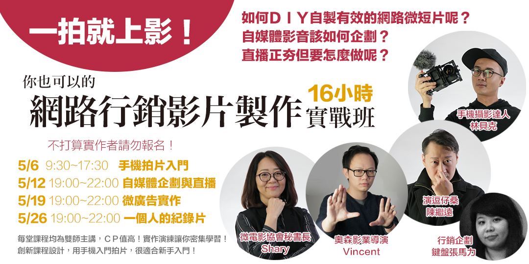 5/6 為期一個月的全方位網路行銷影片製作班,即將開放報名! 請注意我們的粉絲頁公告喔!