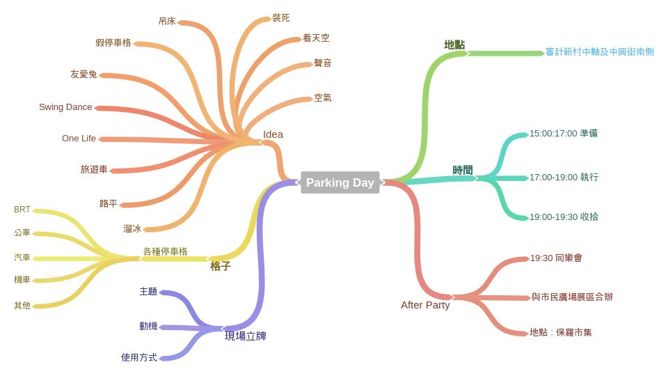 Park(ing) Day 是一個世界性活動,由個人或組織,在九月的第三個星期五,以一天為期,改裝路邊停車格,透過公共藝術或是一種設計體驗的方式,提出一種改善公共空間的想法及策略、或者傳達一種對應城市生活/空間環境/公共領域議題的概念及態度。自2005年開始,透過網路及文字傳播,以及親臨體驗與面對面溝通,超過150個城市、1000個有趣的裝置在世界各地開出一朵朵美麗的花,至此在Park(ing) Day 的那一天,停車格成為市民情感與觀念的交換場所,也是一種公共生活、娛樂,及藝術的具體表現。