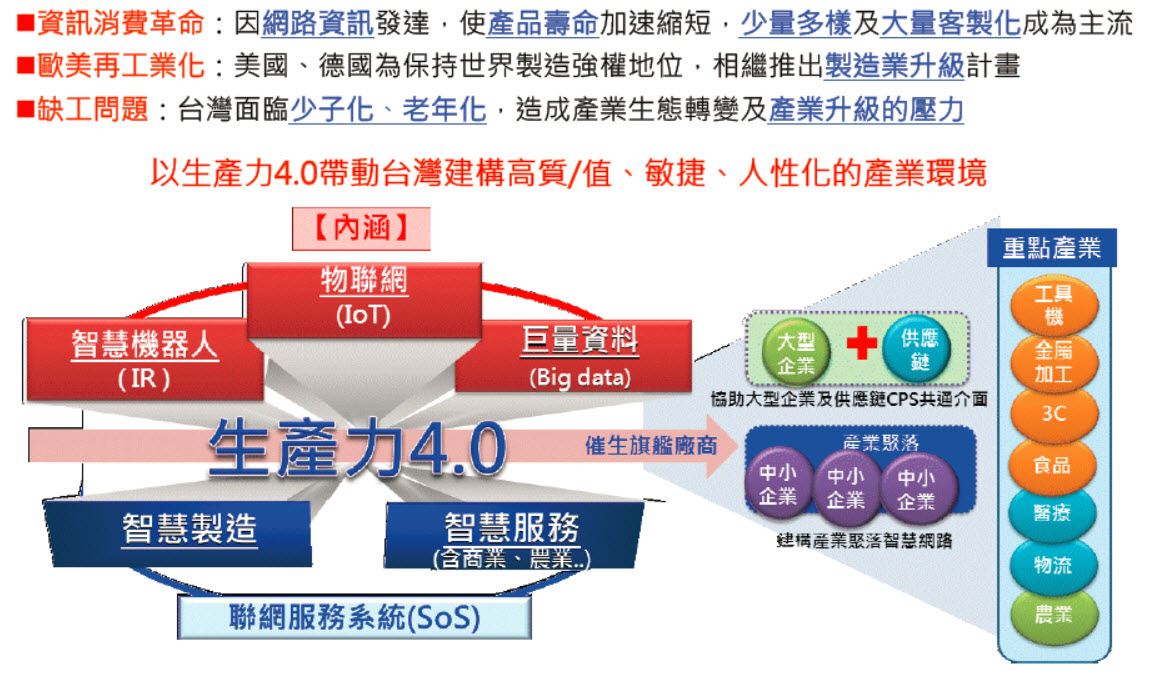 自從美國政府在2009年提出AMP計畫,德國政府在2011年喊出第四次工業革命(工業4.0)後,全球各國紛紛思考如何帶動國內製造業升級轉型,身為製造大國的台灣,當然也是其中之一,行政院於2015年9月推出「行政院生產力4.0發展方案(英文名稱:Taiwan Productivity 4.0 Initiative)」,作為台灣產業升級轉型的大戰略,希望藉由既有在資通訊產業上的優勢,十年內創造人均產值提升30%以上,產業附加價值提升15%,打造台灣成為全球生產製造供應鏈的關鍵地位,同時以因應未來勞動人口減少的挑戰。 - from 天下雜誌