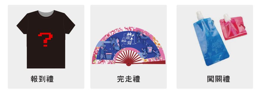 報到完成即可獲得紀念T恤;完成健走憑集章卡兌換完走禮:復古折扇乙份、摸彩券乙張;闖關成功可兌換折疊水壺乙份。