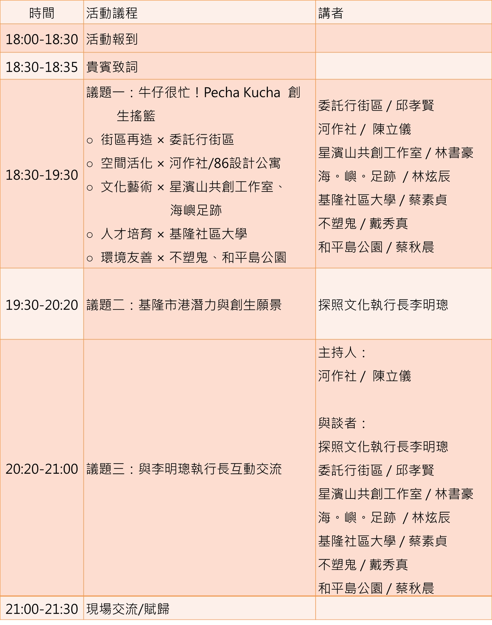 本次「Keelung Future 基隆未來城市」活動主要針對基隆地方發展創生方向,如街區再造、空間活化、文化藝術、人才培育、環境友善進行分享與交流,展現基隆城市底蘊魅力與未來的期待。活動中,將邀請探照文化執行長李明璁、基隆青年培力工作站團隊、地方行動團隊共同加入,期望從不同創生議題中,相關與會人員能更深刻認識在地與找到在地需求,凝聚創生推動共識,強化創生行動實踐。