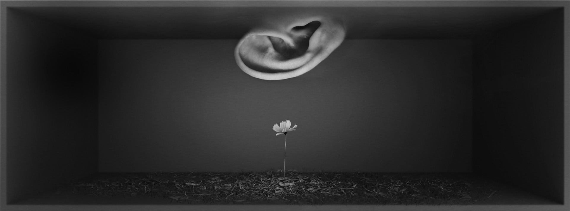 在展覽中,空間借喻為巨型攝影機,觀者成了懸浮其中的一粒光子,由外而內依序經歷過光、景、鏡頭、光圈、反光鏡、對焦、快門、感光,終至成像。然而,這裡沒有故事,所有的風景並非創作者所賦予,而是源自每位觀者自身的人生歷程。因此同一個片刻,將在不同個體中曝光為截然不同的影像。