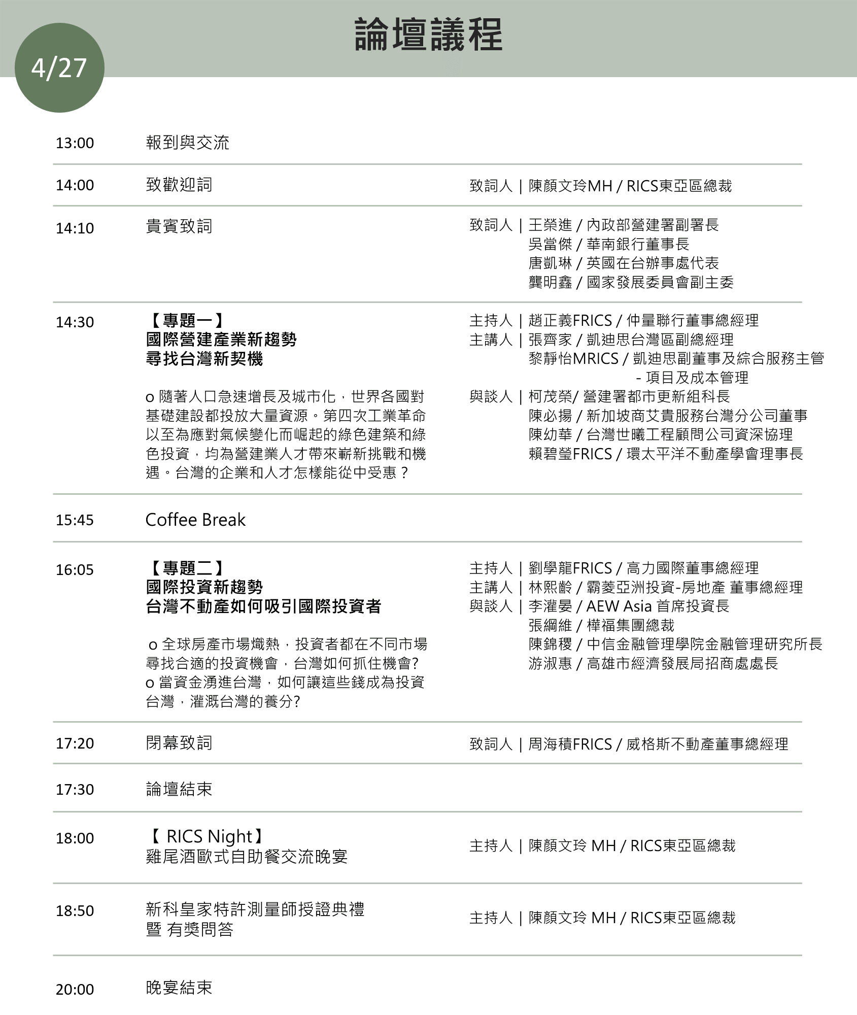 RICS—全球廣為推崇的權威機構,以跨政府層面的視野推行並實踐國際標準,在管理和發展土地、房地產、建築和基礎建設等領域,提倡並實行最高專業資格和標準。RICS為土地、地產、建築和基礎建設創造安全及充滿活力的市場,為全球市民謀福祉。本次論壇將探討國際營建及不動產投資新趨 勢,台灣如何吸引資金、市場、技術與人才,引領台灣業界尋找新契機。