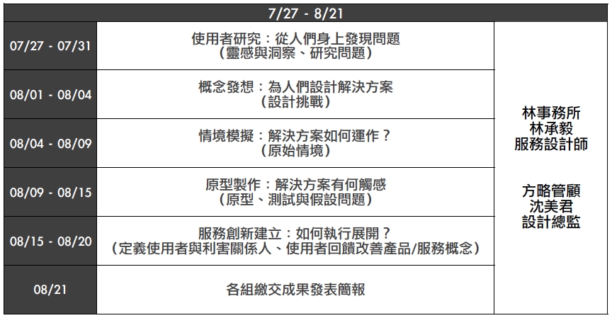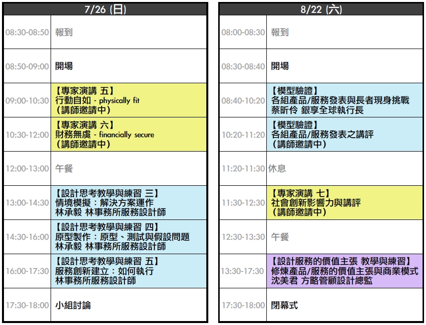 本流程將由「路上的人類學家X儀式設計師」林承毅傳授你於高齡領域設計思考的架構心法,歷經一個月的焠鍊,8/22模型驗證當日,將有十位高人(熟齡、高齡組成)親臨現場,屆時,你需要施展渾身解數以長輩聽懂的語言販售你的服務或產品, 歷經一番討價還價,高人現場高舉笑臉、哭臉挑戰你的產品服務究竟符不符合銀髮族需求。