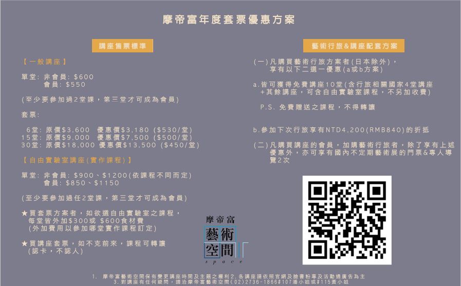3. 如遇活動通票劵已售罄及講座相關詢問請洽 motifpace@motifart.com 或 02-2736-1866 #107 潘小姐。