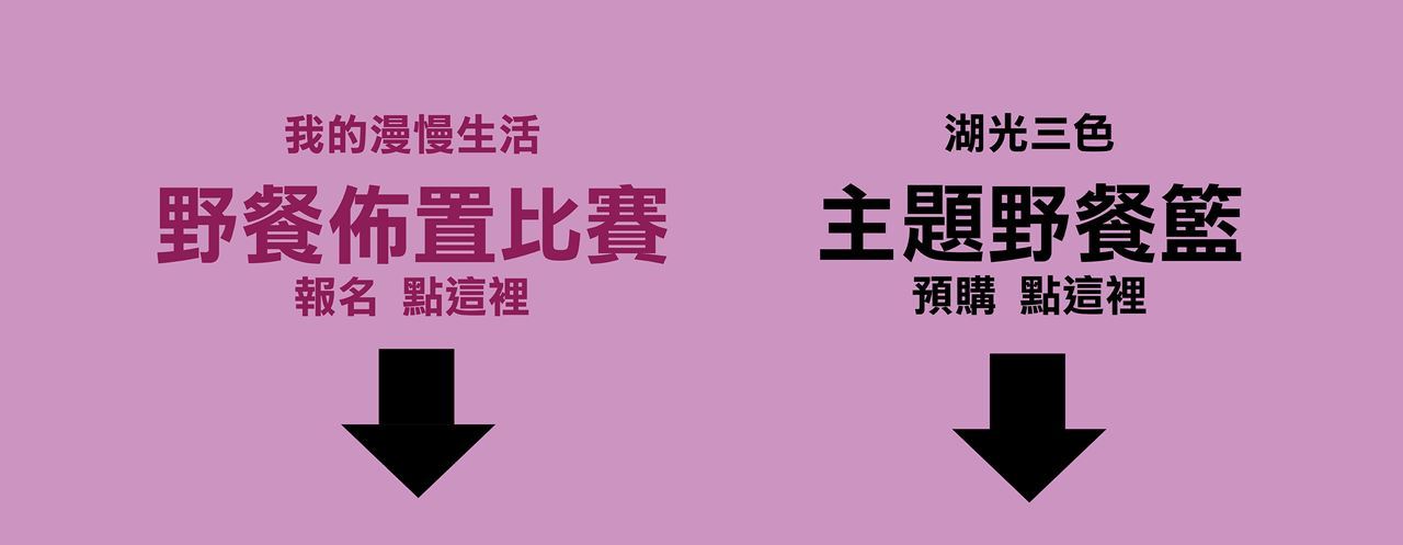 - 16:00 湖光三色野餐會/ 吹泡泡 / 音樂會 / 小島尋寶 / 野餐市集 / 故事小屋 / 我的漫慢生活 野餐佈置比賽投票