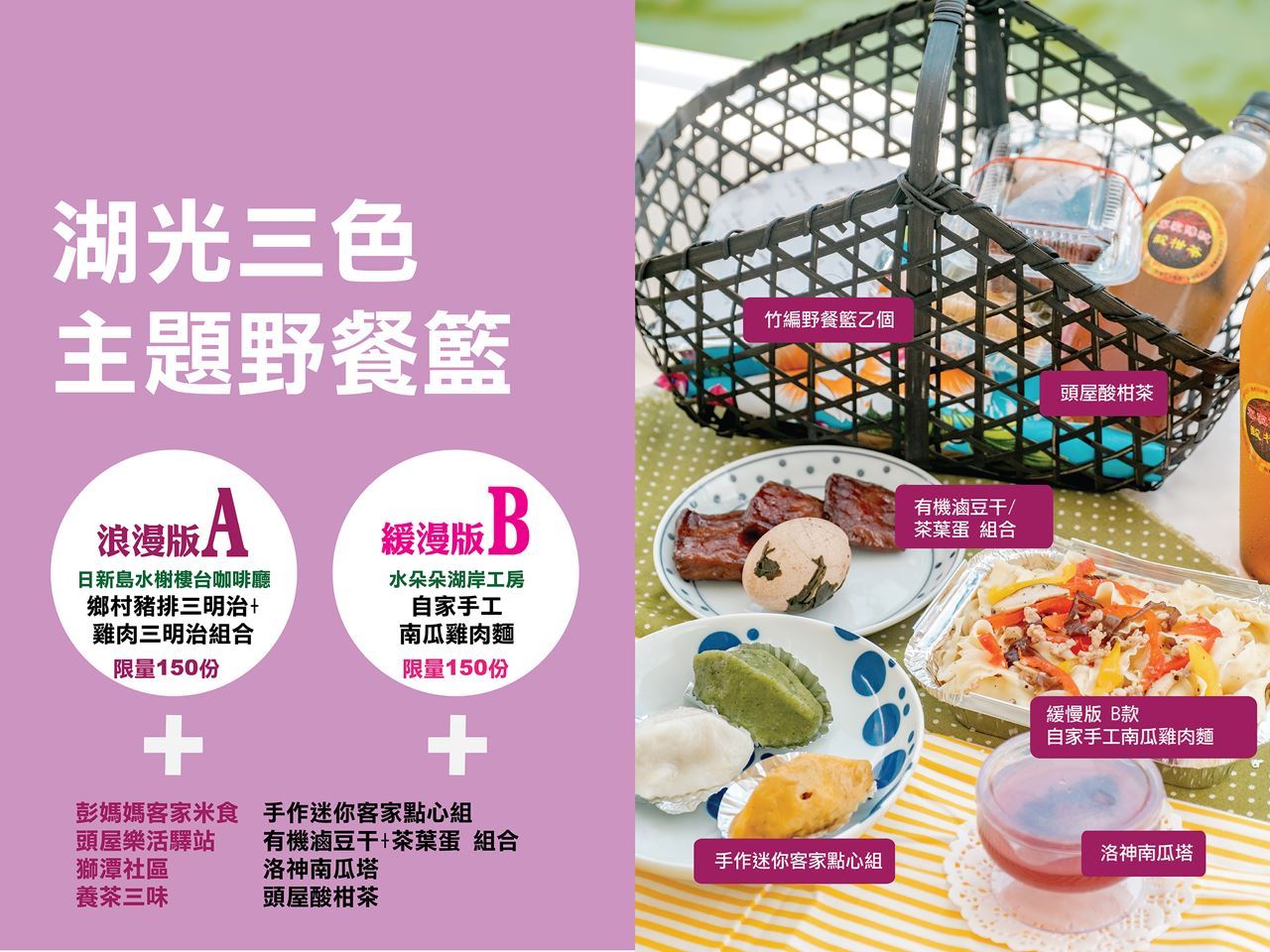 - 民眾可先預購湖光三色主題野餐籃,或於現場樂活市集、水榭樓台咖啡廳購買或自備食物