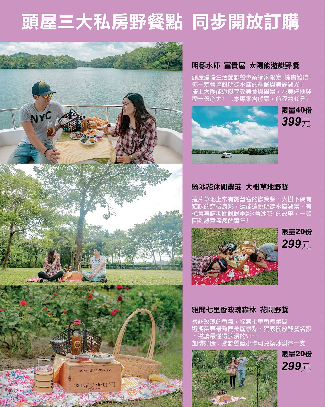 野餐餐點乙份-主食+副食+點心+飲料、竹編野餐籃乙個-價值150元、吹泡泡水乙罐、頭屋樂活地圖、頭屋樂活聯盟VIP專屬優惠券乙份
