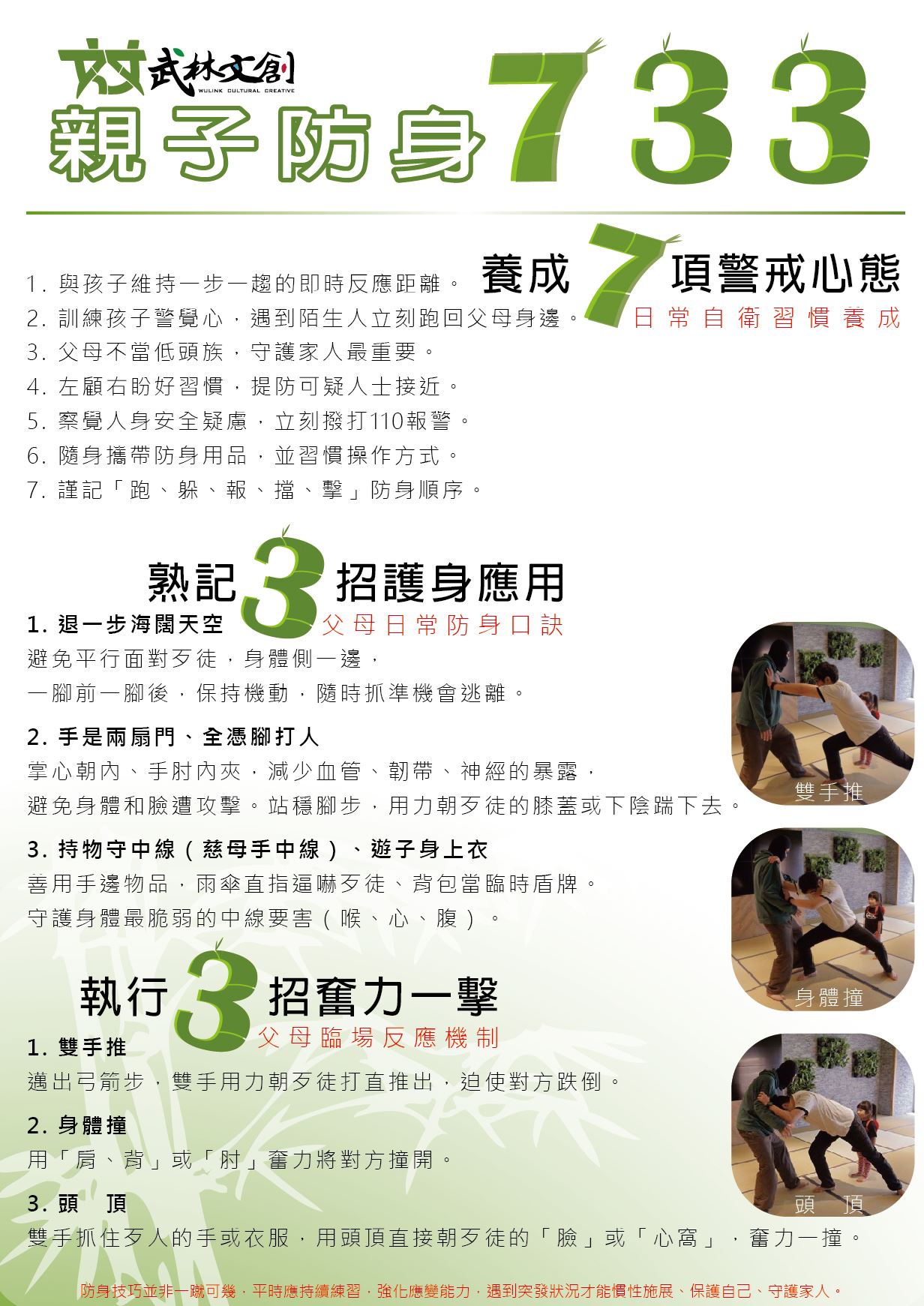 武學人文會館館長任培豪長年推廣「733日常親子防身」,包括建議家長養成7項警戒心態、熟記3招護身應用,緊急關頭執行3招奮力一擊。任培豪宣導「父母應與幼子一起學習防禦」,需於平時加強培養與孩子之間的防身默契。