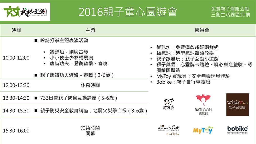 2016親子童心園遊會,促進親子互動,邀請爸爸媽媽與孩子一起找到快樂的童心。現場將有:鮮乳坊、蝠氣球、親子跟風玩、獅子與貓、MyToy 買玩具、bobike等優質活動,為孩子與家長營造美好的親子時光!