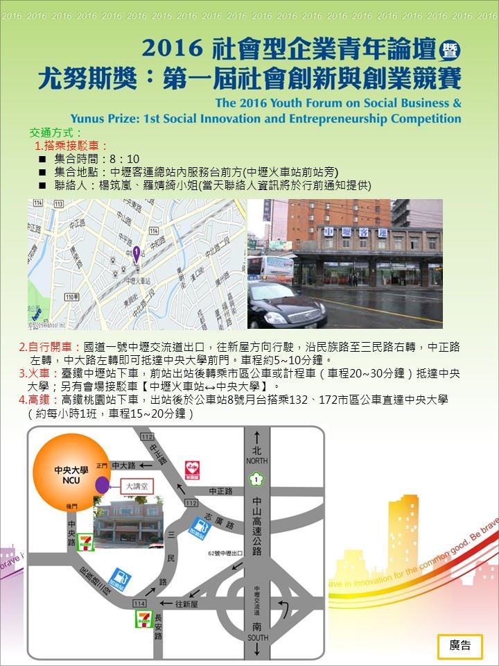 國立中央大學尤努斯社會企業中心、勞動部勞動力發展署桃竹苗分署、財團法人台灣尤努斯基金會為鼓勵青年以創新方式投入社會服務或社會企業創業,並搭建國際交流的平台、透過國際合作推展社會企業的經驗分享以促進我國社會企業的發展,於今年舉辦一系列社會企業相關活動。「2016社會企業發展與管理國際研討會」暨「尤努斯獎:第一屆社會創新與創業競賽」準決賽已於6月6日圓滿結束,緊接著要登場的是8月25日將於中央大學大講堂舉辦「尤努斯社會型企業青年論壇」暨「尤努斯獎:第一屆社會創新與創業競賽」決賽。