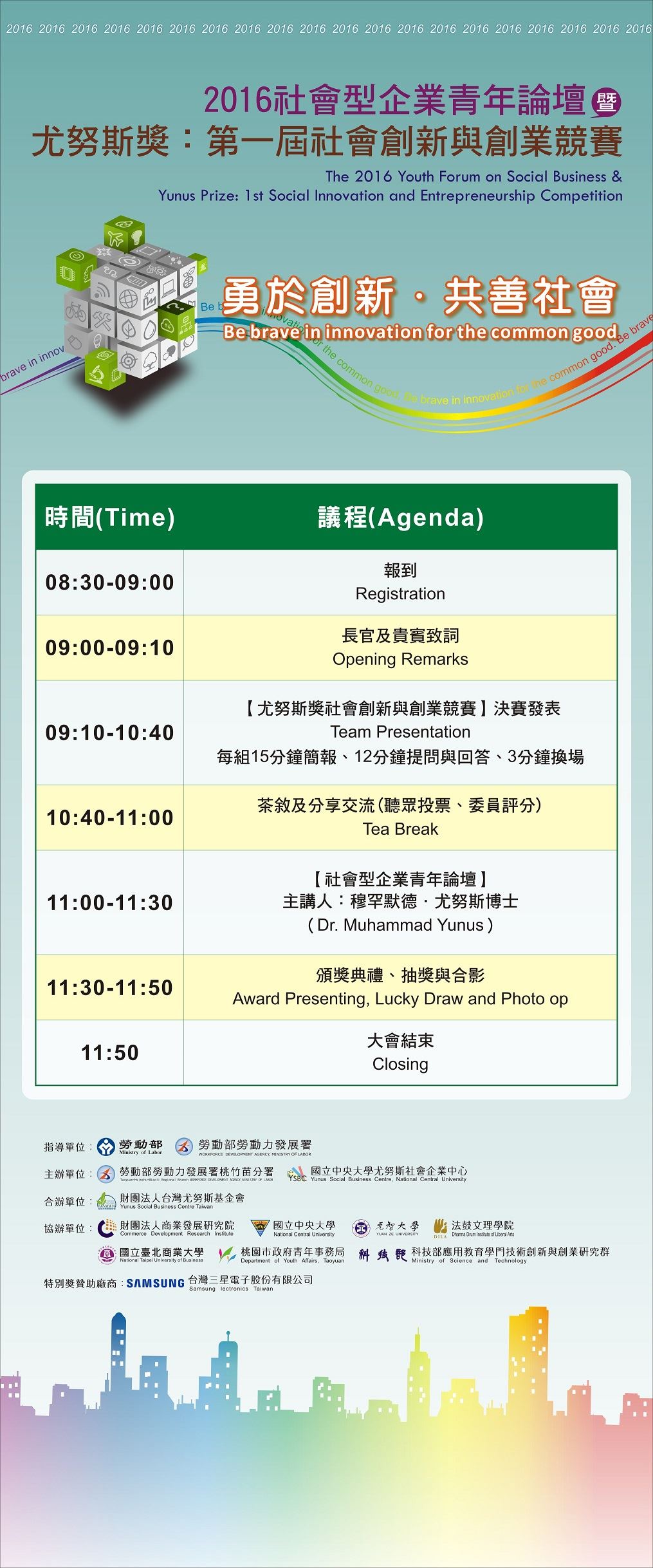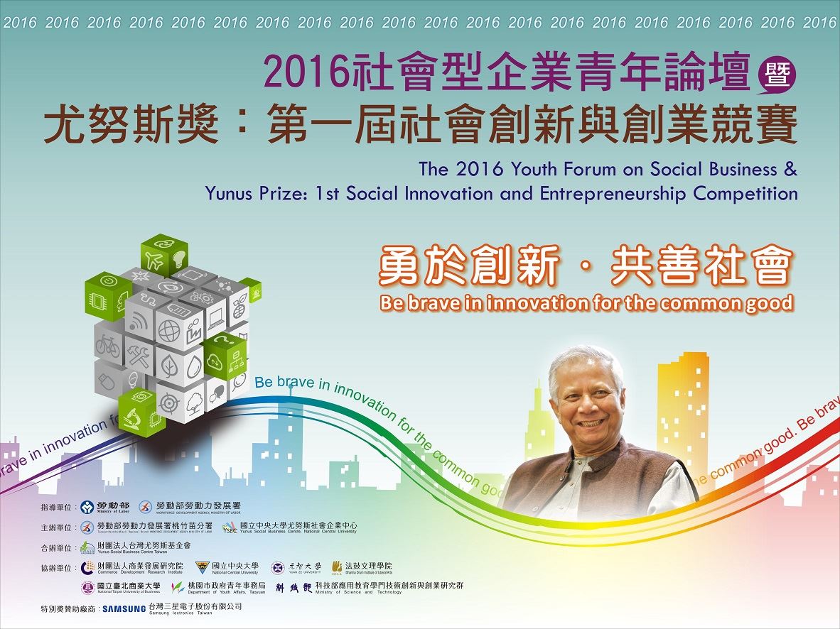 主辦單位特別邀請到尤努斯博士親自來台,為「2016社會型企業青年論壇」發表專題演說,並擔任「尤努斯獎:第一屆社會創新與創業競賽」決賽的評審團主席,為競賽隊伍提供建議與頒獎。社會企業創業組決賽將由「衣想世界」、「Global Scavengers」、「幫 TRUE」等三組團隊角逐最終優勝,其提案主題分別為二手衣物交換、改善偏鄉經濟及提供多元就業,以及便民且透明化物資捐贈平台等創業計畫。另外,當日亦將進行社會創新服務組以及特別獎獲獎團隊的海報展出。
