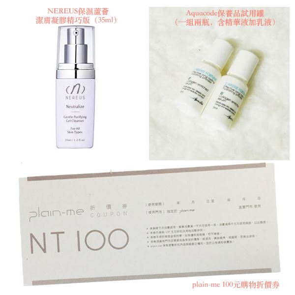 贈品 『保濕蘆薈潔膚凝膠精巧版(35ml) 』由NEREUS提供 ; 『Aquacode保養品試用罐』由美麗晶華診所獨家代理提供 ; 『plain-me 100元購物折價券』由 plain-me 提供 !