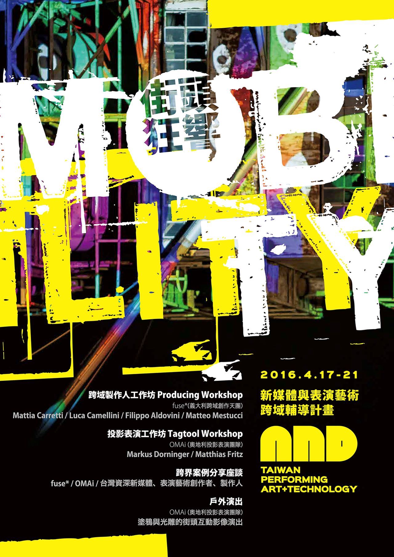 投影技術在空間氛圍的營造及視覺物件的轉化上,具有即時且戲劇效果強烈的優點,且應用上技術門檻較低。【MOBILITY 街頭狂響】以投影技術的機動性延伸,討論讓表演藝術走入街頭,進入日常的方式及實踐。除了邀集 OMAi(奧地利)及 fuse* (義大利)兩組擅長以投影技術作為創作媒介的國際團隊舉辦工作坊及座談,在互動投影、即興投影的技術結構下,進行技術輔導並分享團隊豐富的跨域及表演經驗。也邀請了已經在臺灣於「戶外劇場」、「非傳統劇場」空間耕耘許久的資深表演藝術團隊、創作者及製作人、劇場技術人員分享各自的跨域經驗,敬邀新媒體藝術與表演藝術相關工作者參與對談交流,並期待有更進一步的合作火花。