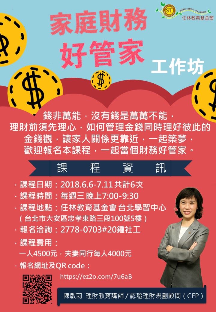 ‧文案: 走進家庭之後,才發現需要具備管理才能,時時管理時間、金錢、家務等等….。錢非萬能,沒有錢是萬萬不能,理財前先理心,管理金錢同時理好彼此的金錢觀,讓家人關係更靠近,一起築夢踏實,本課程邀請您,一起學習當個財務好管家。