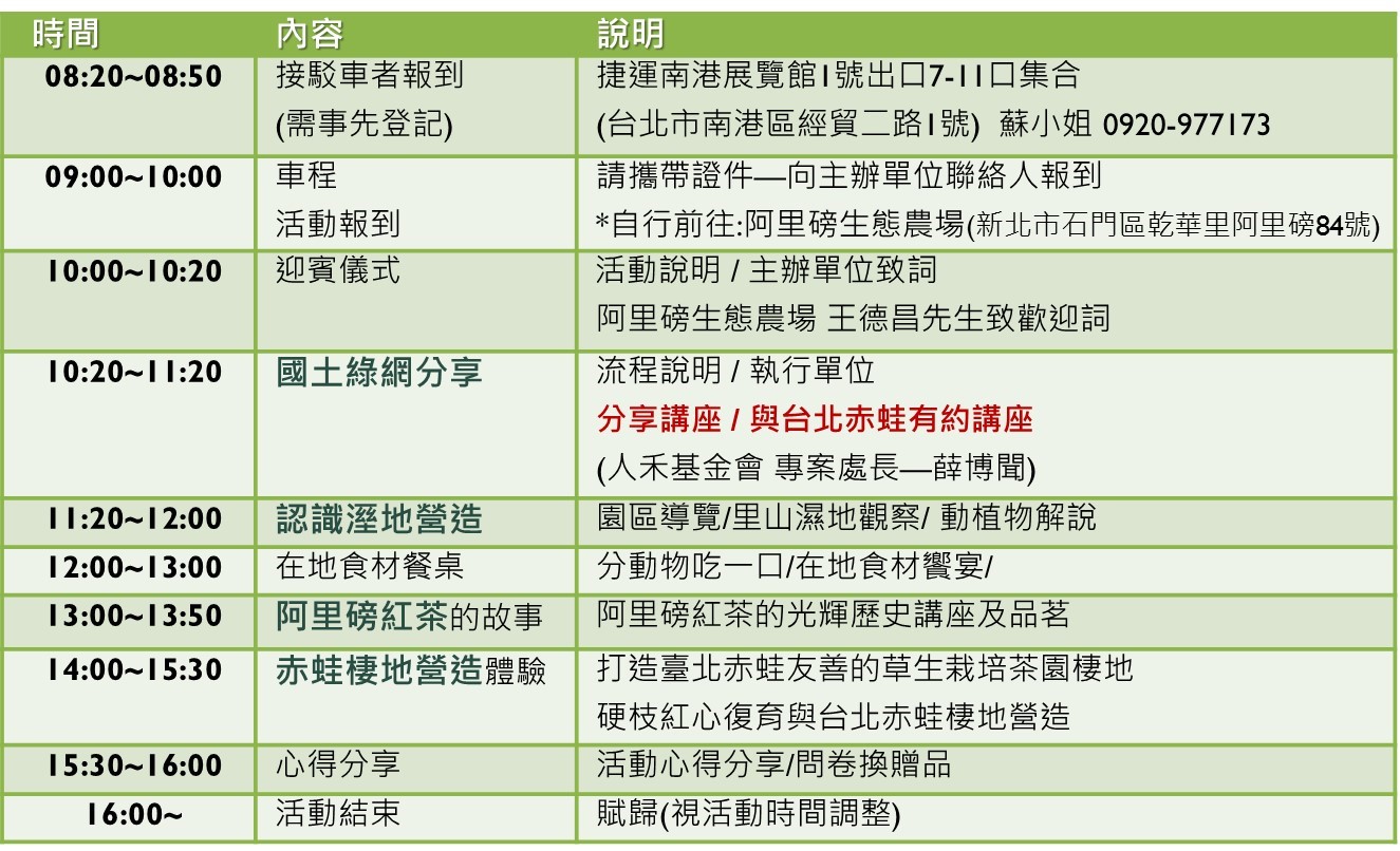 自行前往者,請於9:40至阿里磅生態農場(新北市石門區乾華里阿里磅84號)集合。