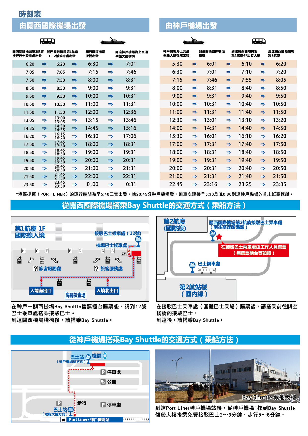 Bay Shuttle售票處購票→12號巴士站乘聯運巴士(5分)→機場乘船碼頭→高速船(30分)→神戶