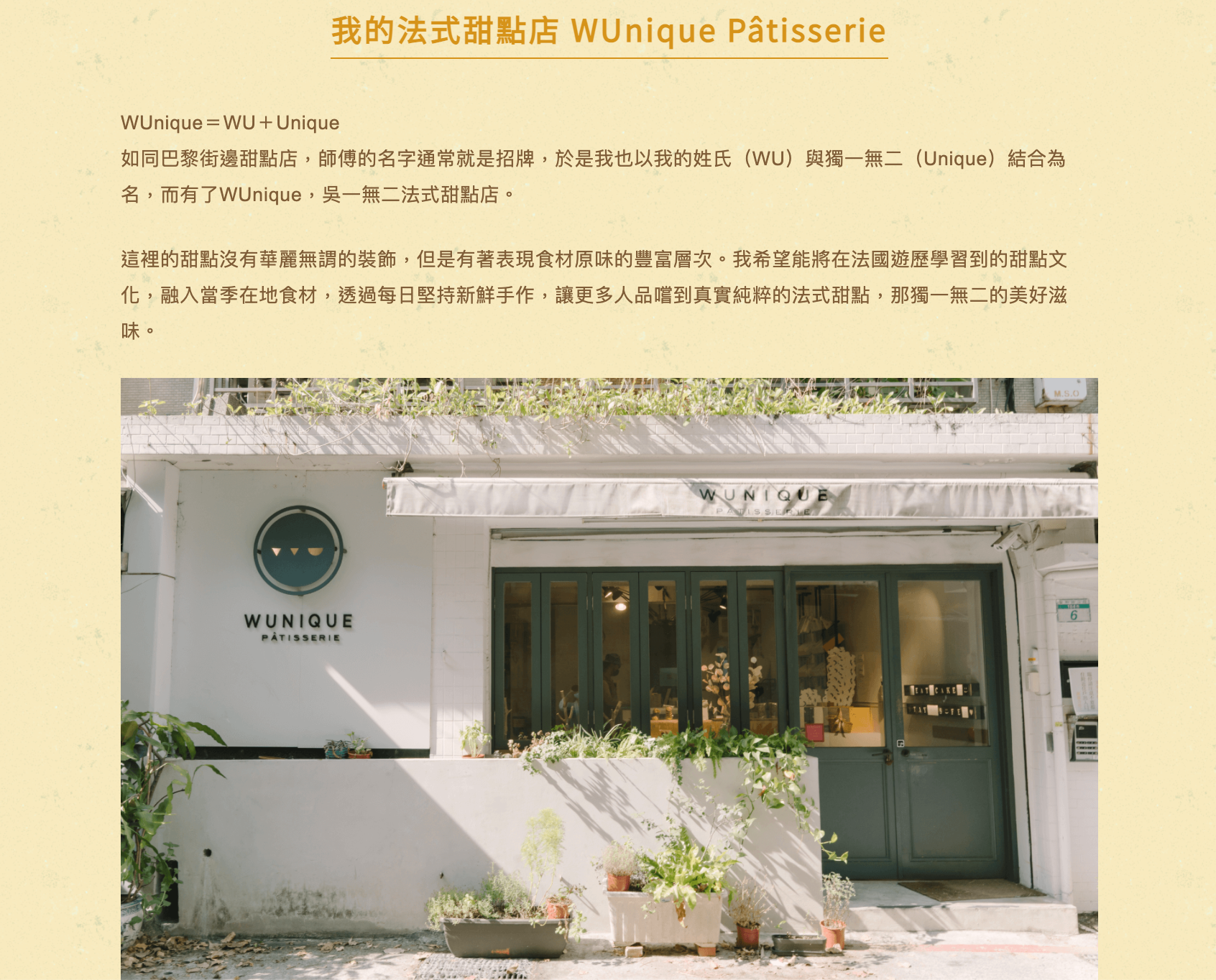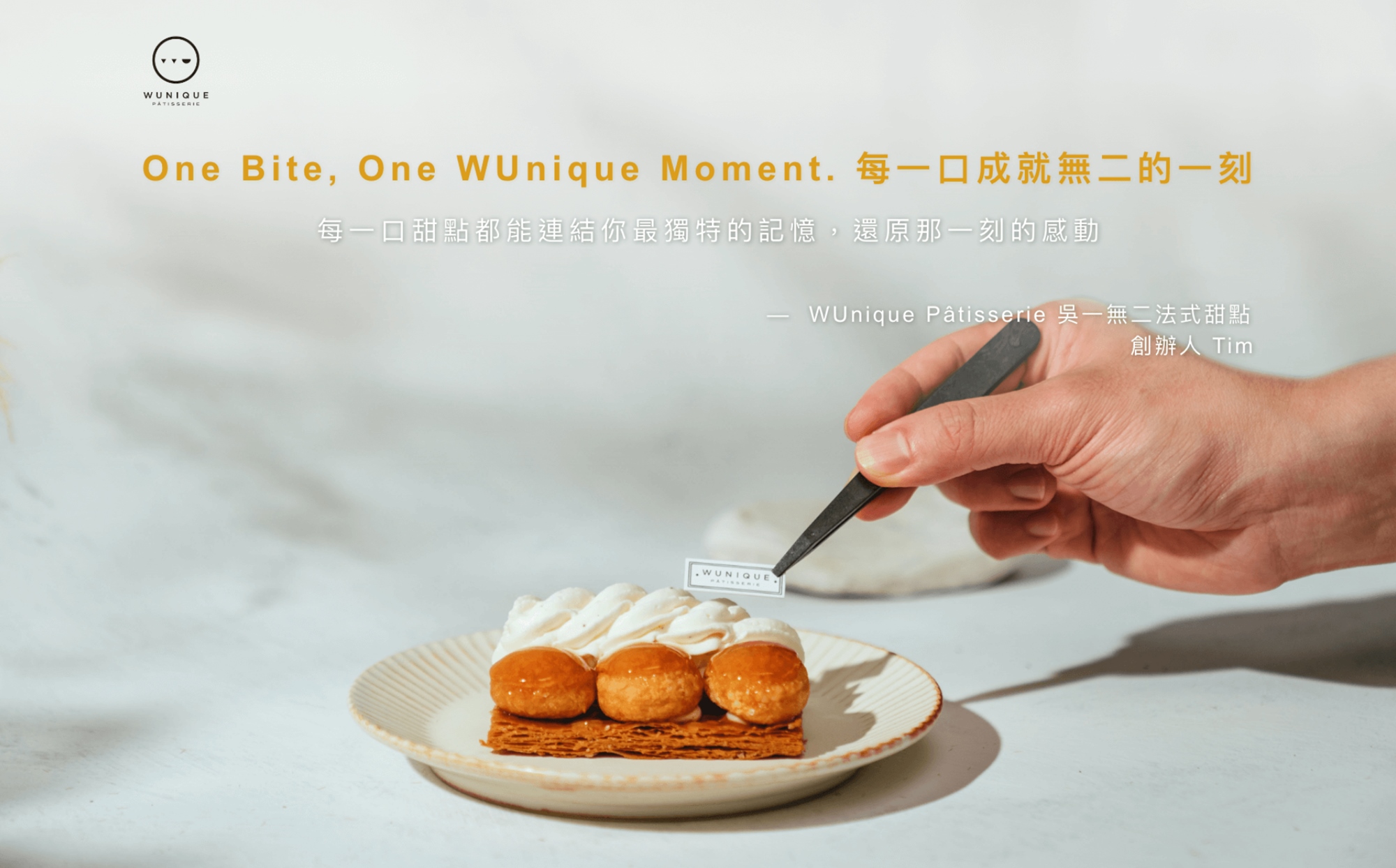 如同巴黎街邊甜點店,師傅的名字通常就是招牌,於是我也以我的姓氏(WU)與獨一無二(Unique)結合為名,而有了WUnique,吳一無二法式甜點店。