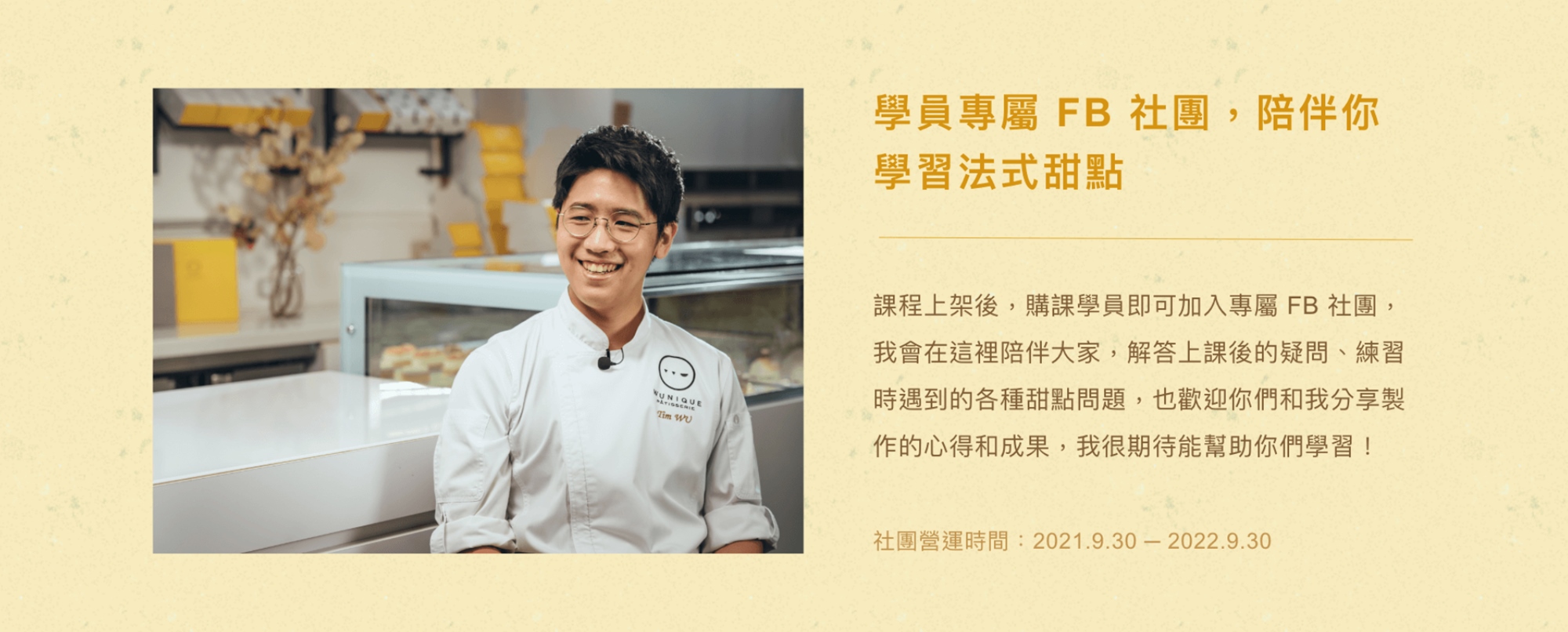 熱愛法式甜點精緻的風味層次,即使零基礎,也想和 Tim 一起開始學習甜點,踏出屬於自己的第一步。