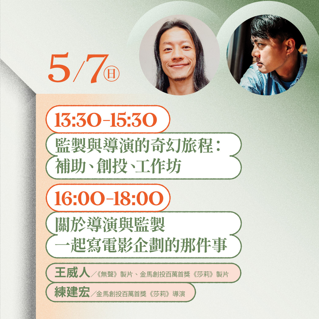 以《莎莉》奪下金馬創投百萬首獎從而斬獲世界創投獎項的王威人監製與練建宏導演,將以他們彼此合作的豐富經歷,談起這趟從劇本開發、企劃提案到參與創投的奇幻旅程,藉由實際案例解析,不同觀點和視角下,分享關於導演與監製一起寫電影企劃的那件事。