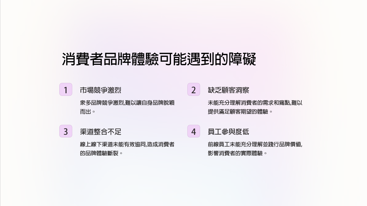 在本次活動中,我們深入探討了5A消費者品牌體驗流程,全面了解了其各個環節及其在品牌推廣中的重要性。5A流程包括五個主要階段:Aware(認知)、Appeal(吸引)、Ask(詢問)、Act(行動)、Advocate(擁護)。以下是每個階段的重點內容: