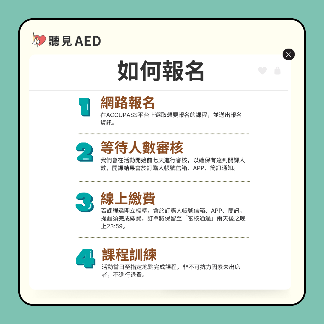為了確保報名人數達開課人數標準,我們會進行報名人數審核,開課結果會於開課前七天公布,並利用ACCUPASS平台進行通知,請留意訂購人帳號信箱、APP、簡訊