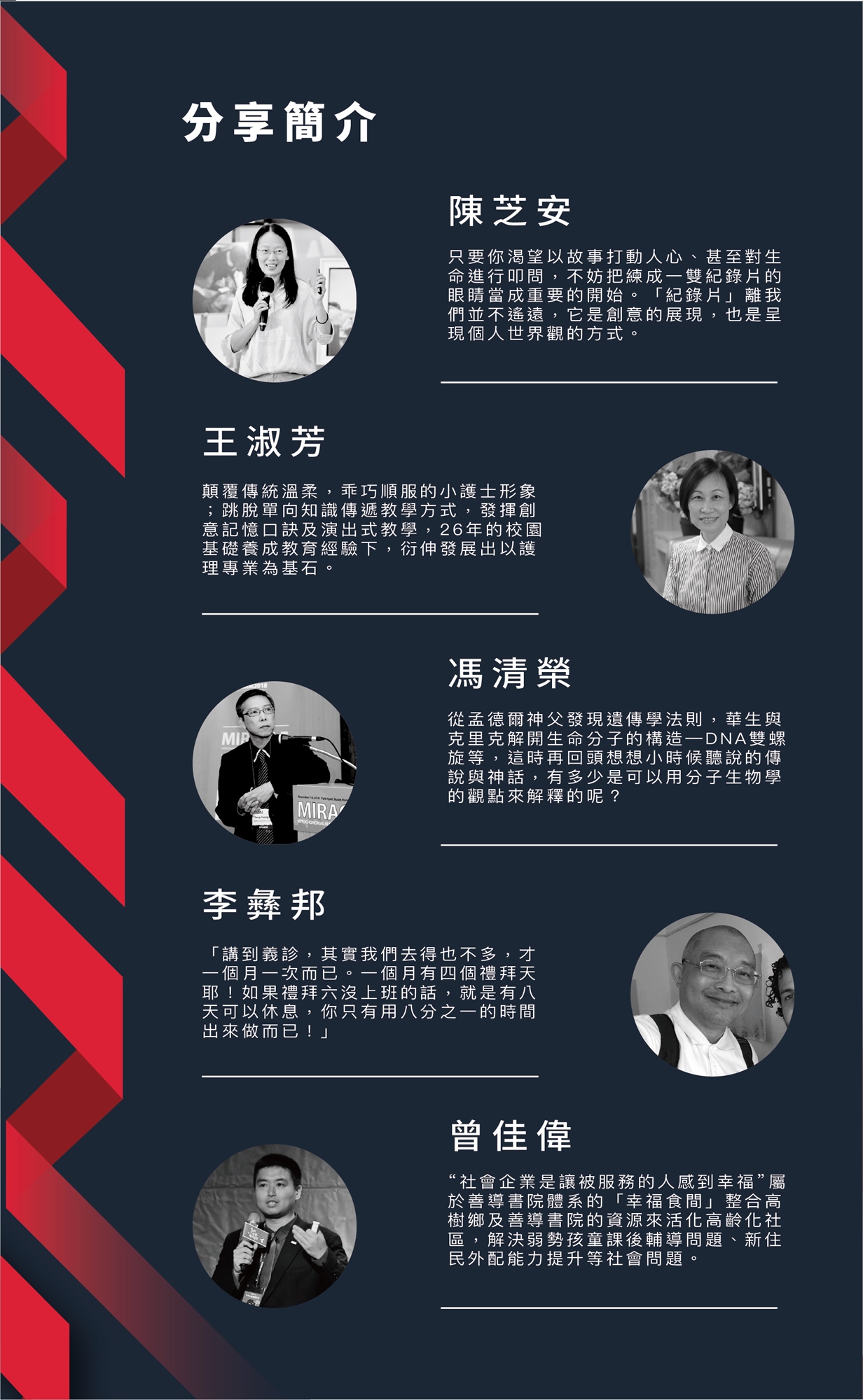 於不同領域之五位講者跨足影視紀錄、護理創新、科學神話、醫療義診、社會企業,帶來不同人生產生的不同感動。