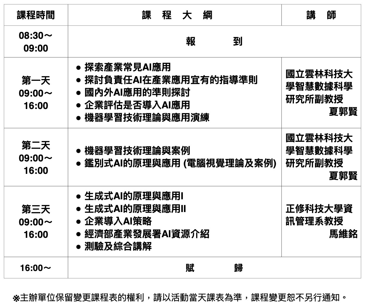 透過基礎理論、國內外案例分享與實作,提供學員AI基礎理論、技術應用及產業實務經驗的全方位指導。
