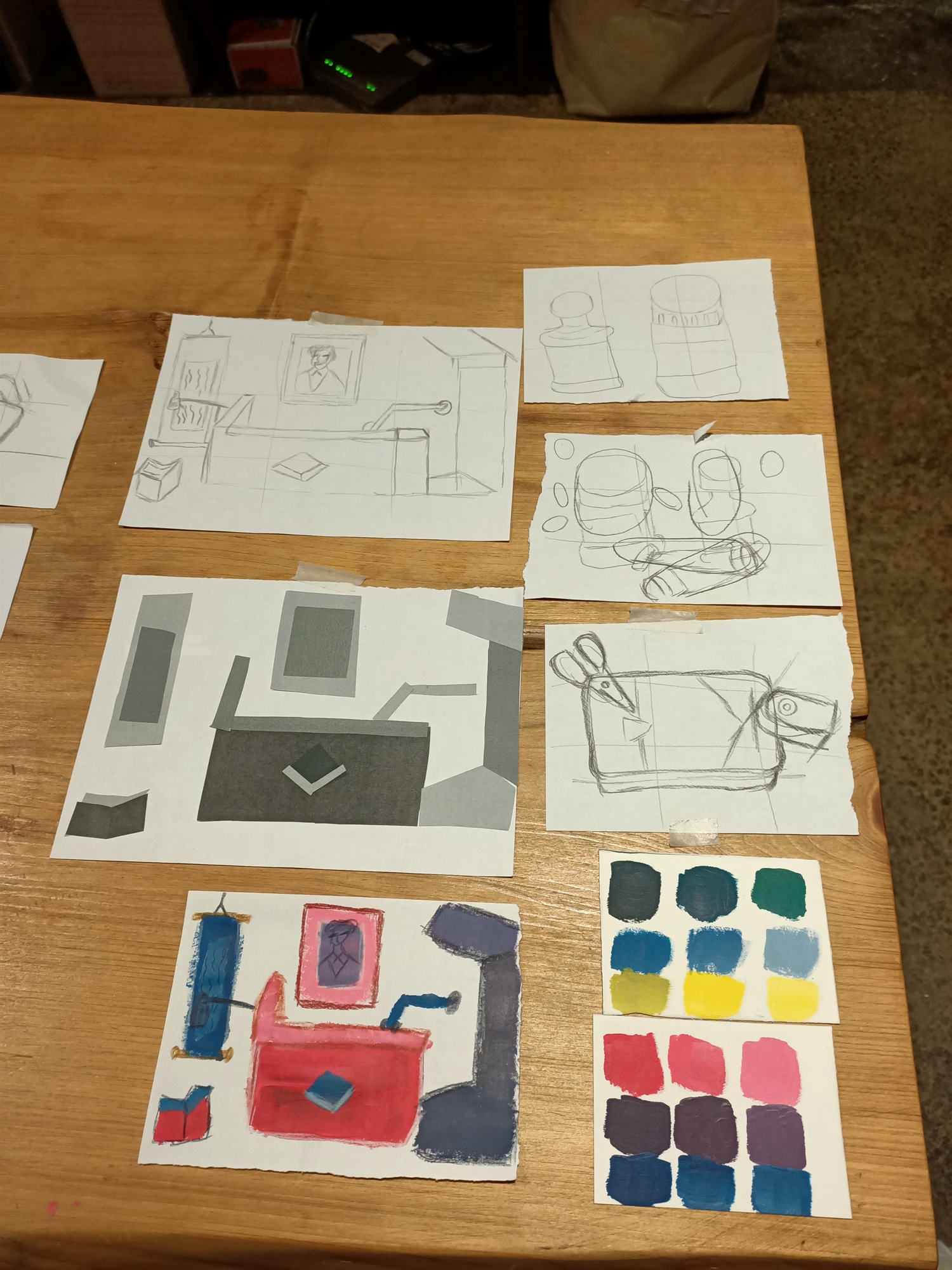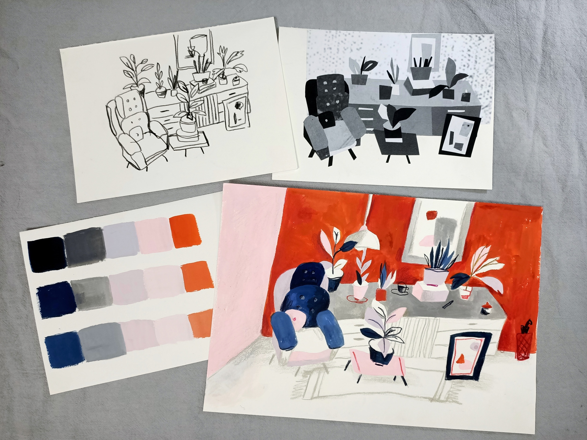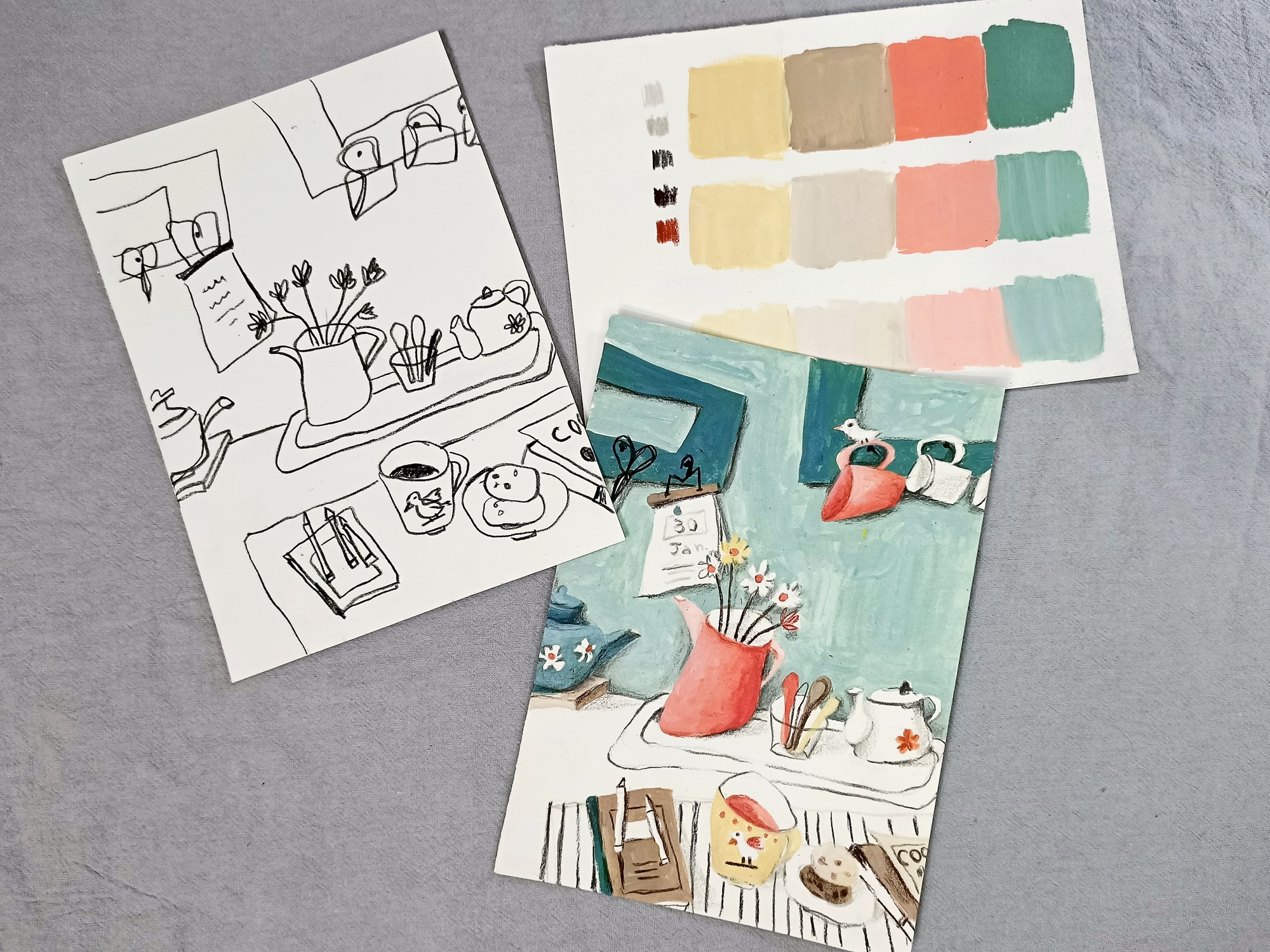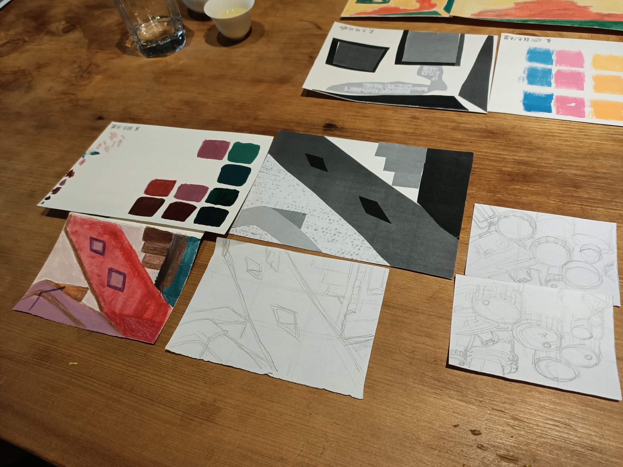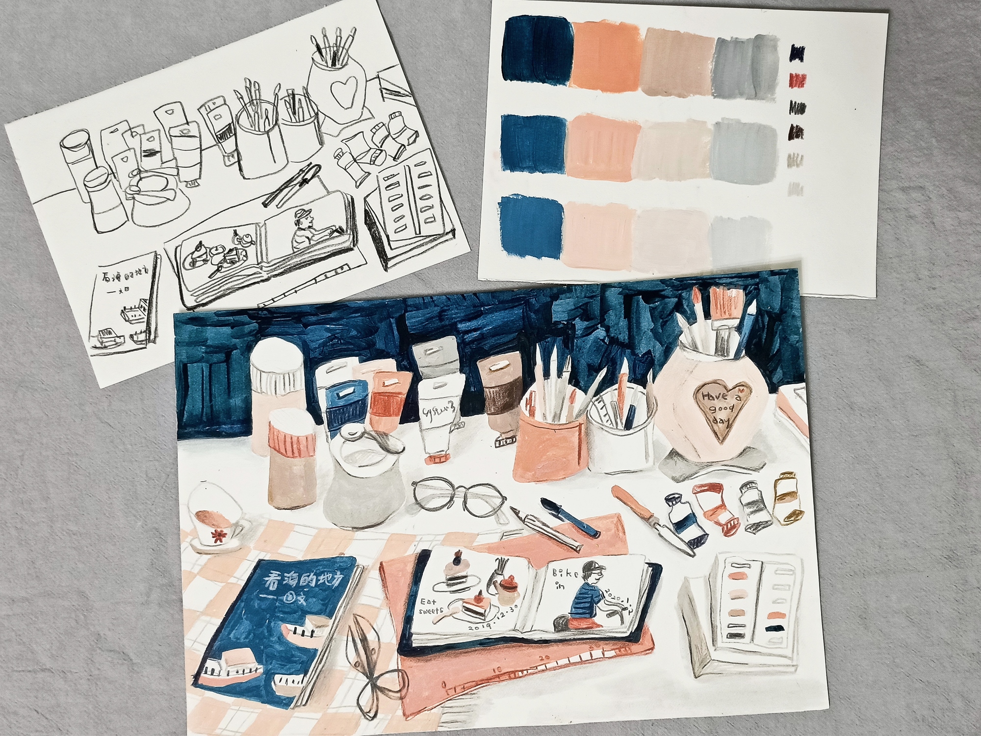 是否有時候在畫草稿時會覺得自己草稿畫得很棒,但開始上色時就覺得自己毀了要完稿的作品,而一切都要從完稿前的各種多元的縮圖構圖練習,練習不同的色彩配置、媒材結合,最後再完稿。