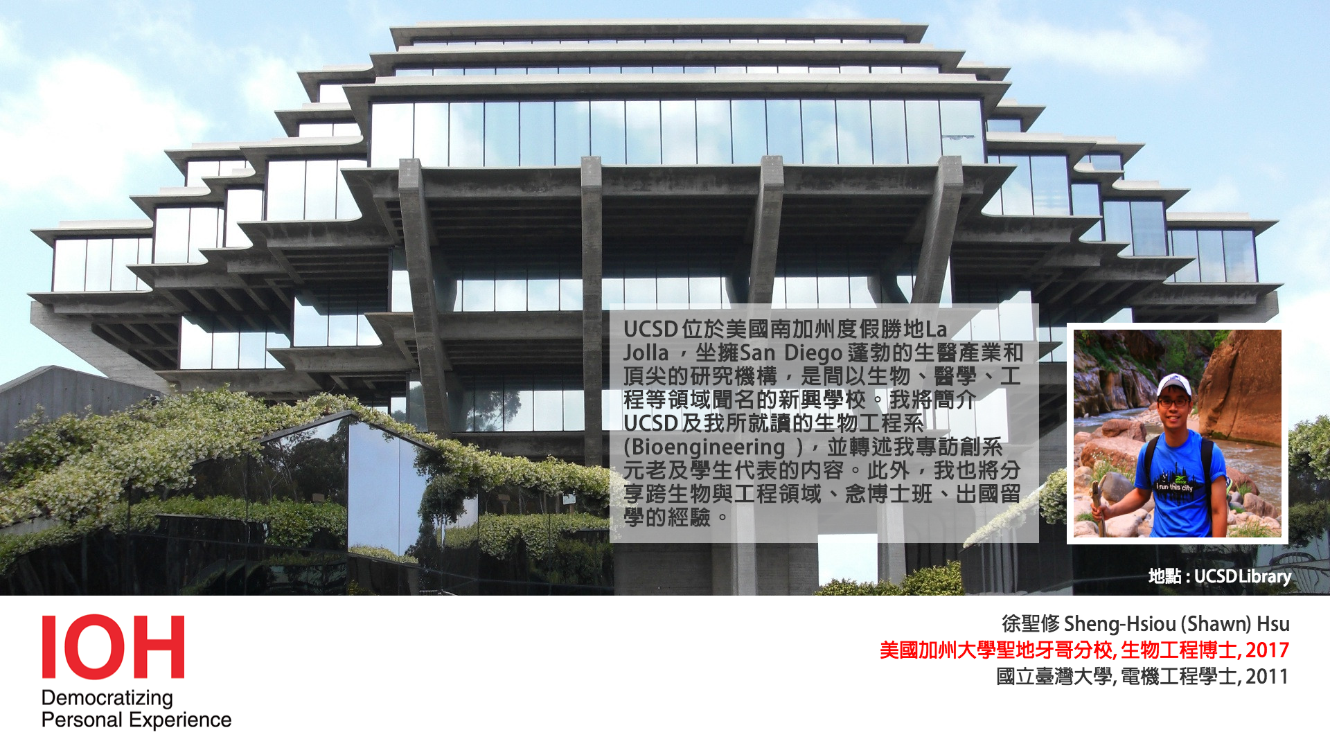 [IOH 講座活動] 美國加州大學聖地牙哥分校(UCSD)生物工程博士生 Shawn 徐聖修留學經驗分享