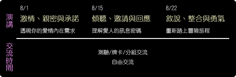 - 時間:8/1、8/15、8/22(五) 晚上7:00~9:30