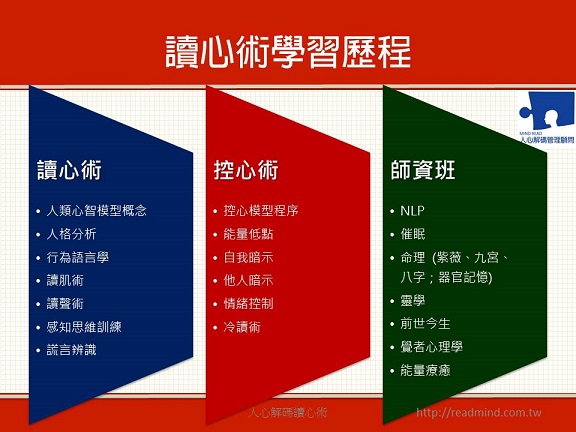 讀心術時至2013年,兩岸在這類叢書已在短短三年之間,出版多達400本以上,這個現象充分反映了市場和社會,開始熱切地對這門技術接觸和認識。但也一時之間,各門各派魚目混珠的書籍之充斥書市….,但卻沒有一個真正專業教學讀心術大師,能夠真正帶領大家學習到這門受益終身的技術。