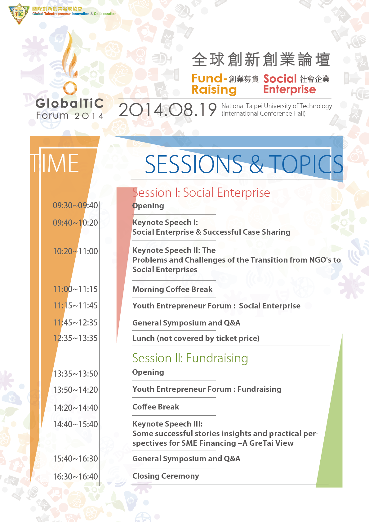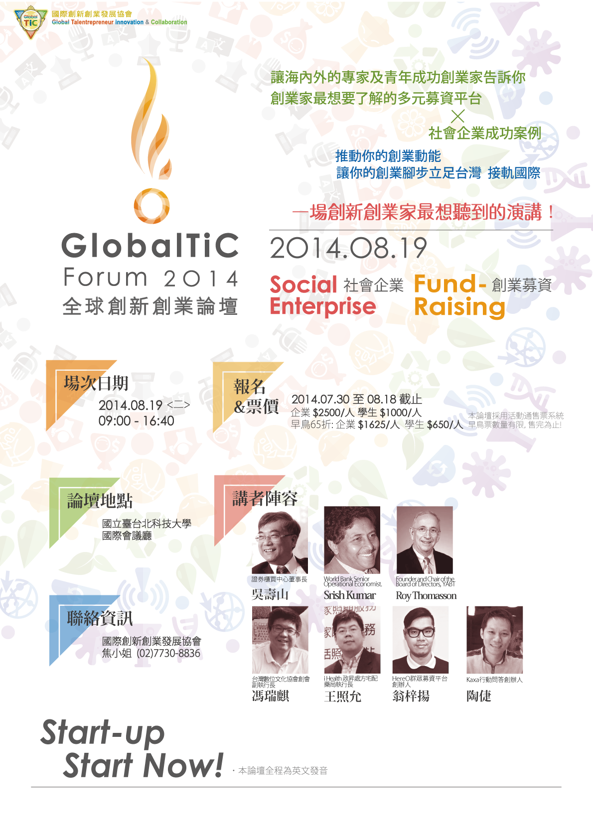 本次『2014 GlobalTiC Forum 全球創新創業論壇』邀請多國專業人士參與,我們希望提供海內外創新創業優秀青年團隊更多創業動能,