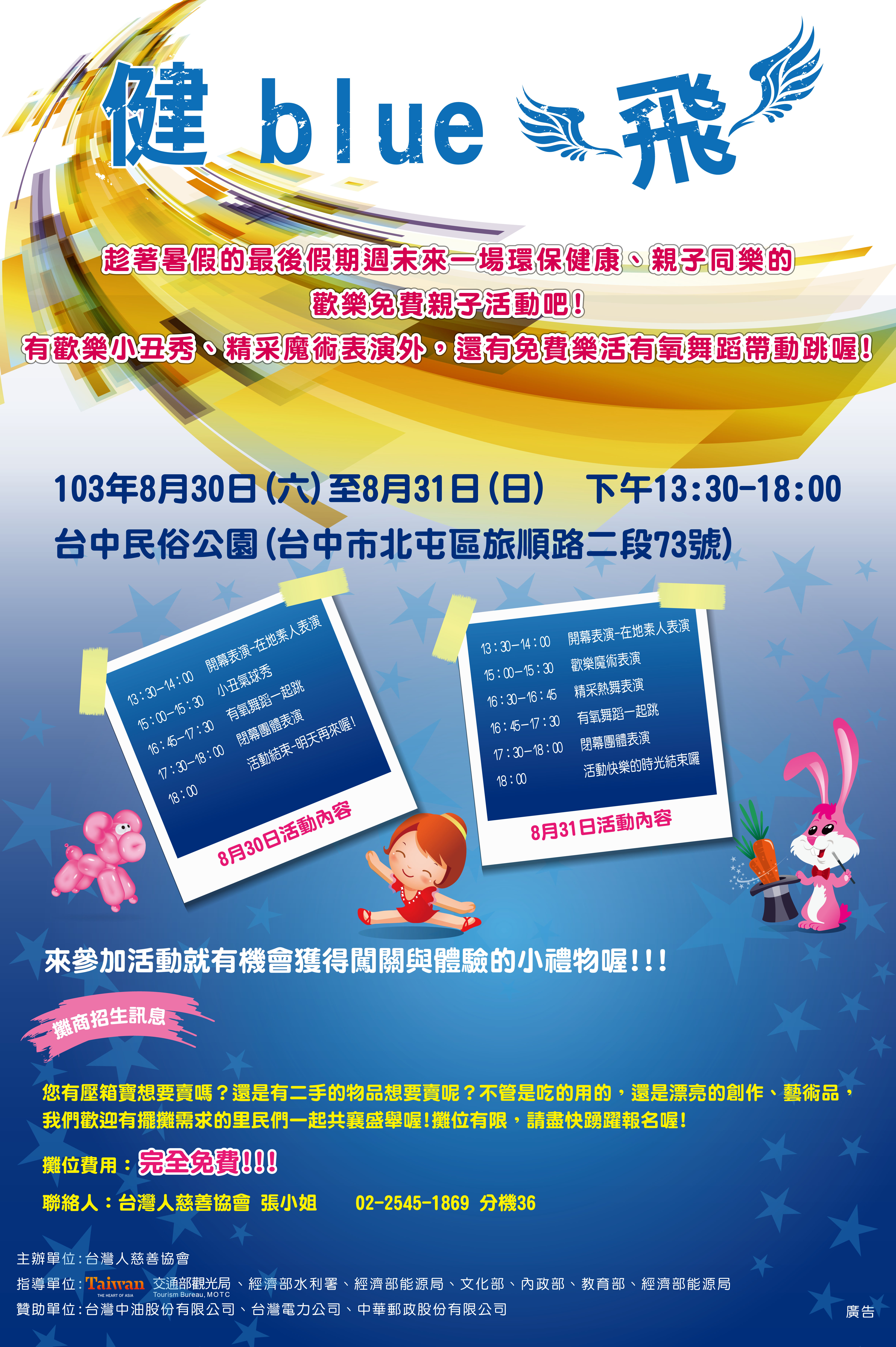 現場有健康主題的舞台活動、有氧舞蹈帶動跳、精采小丑氣球秀、歡樂魔術表演、素人藝人表演,