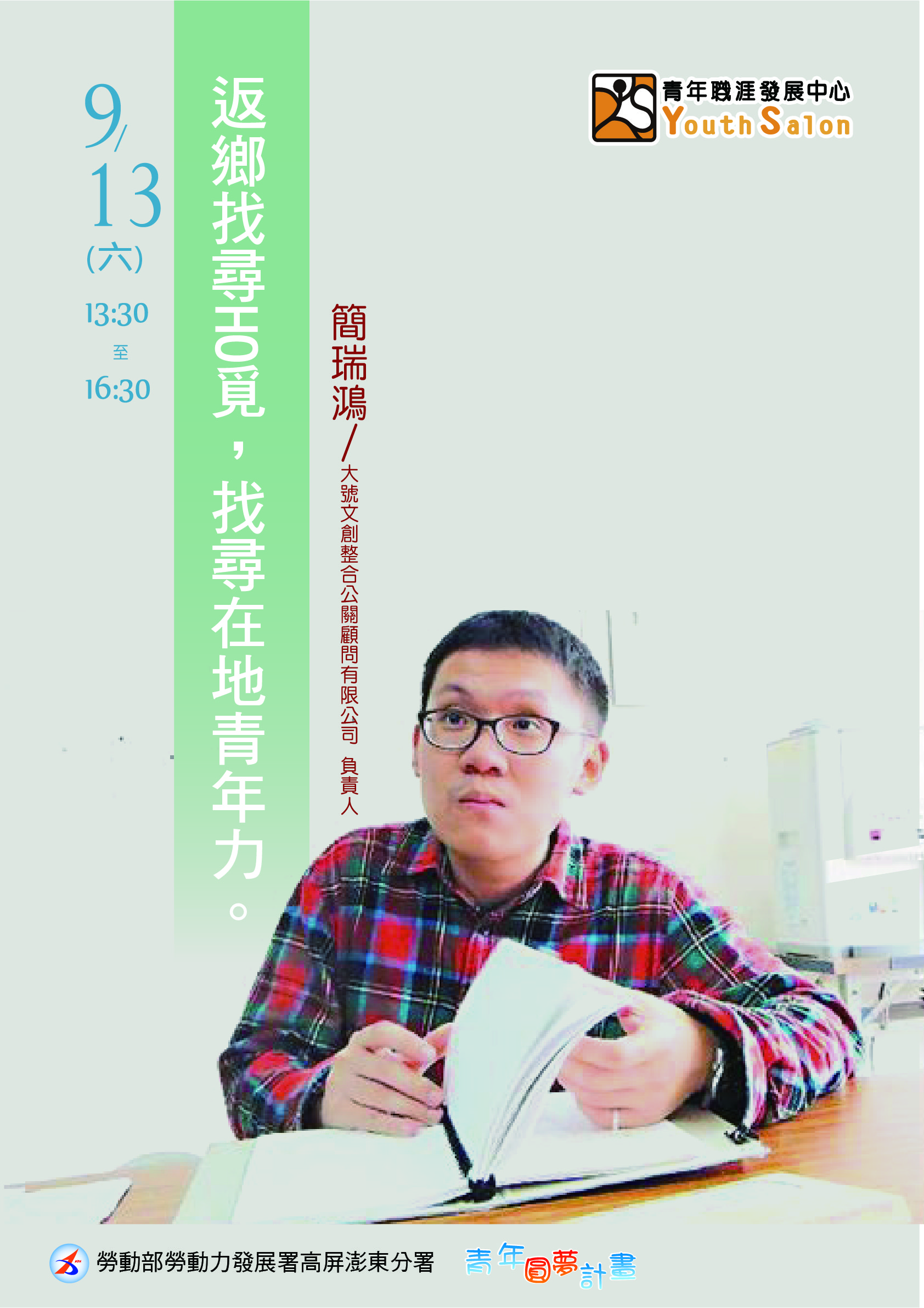 | 探索找尋好東西,期待透過行動力來帶動地方青年力,串聯整合讓更多力量可以彼此交互作用,一起為這方土地來儘一份心力, 創業已經來到了第八個年頭,二十歲開始打造自己的藍圖,一步一腳印開創自己心中的期待與想像,實踐,不畏懼困難不給自己退路,你,曾經為了一件事堅持超過五年嗎? 戲棚下站久就是你的! YS邀請到大號文創整合公關顧問有限公司 簡瑞鴻 負責人分享實踐夢想經驗,你有想要創業夢想嗎?快來報名 |
