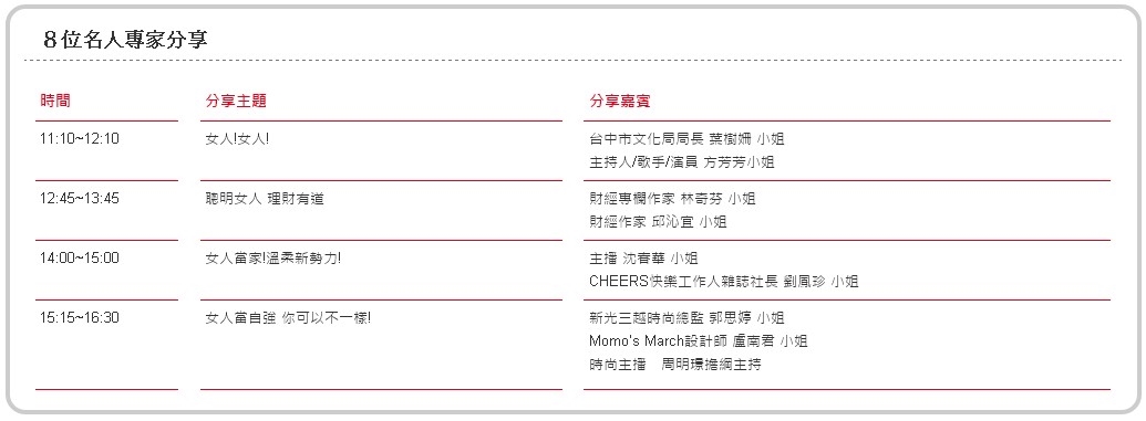 針對台灣女性所關心「理財、職場,生活」三大面向,邀請多位名人及專家,台中市文化局長 葉樹姍、名主持人 方芳芳、主播 沈春華、財經作家 邱沁宜、新光三越時尚總監 郭思婷、珠寶設計師 盧南君…等進行分享,讓女性在找尋目標及方向時,能有更清楚和全面性的思考!