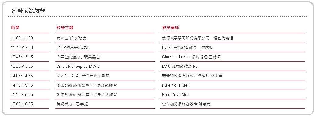 - 教學內容:以資深人資專家角度分享女性在職場應該展現與抱持的態度、職涯管理技巧,讓自己既能展現女人的優雅,又能無往不利,更上一層樓!