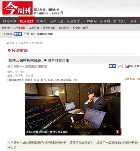 36歲享財富自由,累積億元身家的他,練就一套高勝率的技術分析投資心法。由三部電腦組成的看盤工作室前,一張大圖輸出的技術線圖貼在白牆上,格外醒目,1995年的台苯走勢圖,股價如溜滑梯一路陡降,最高價123元,至最低價37.8元,是他人生賠過幅度最大的階段。「這是自我警惕,鞭策自己一定要提高台股操作勝率的一面警告!」位在南高雄市值近6000萬元的百坪高級住宅裡,現年36歲的康進清語氣堅決地說。