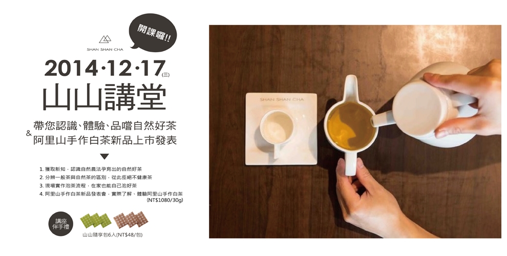阿里山手做白茶上市發表,在台灣普遍接受到的通常是綠茶、烏龍與紅茶,鮮少聽過與喝過白茶,那白茶是什麼呢,與其他的茶差異又在哪裡?山山來茶的育茶師嘉文,阿里山上的茶農二代,堅持使用自然農法,從採茶到製茶,完全自採自做,只為呈現出心中最完美的茶湯,這次的阿里山手作白茶就由嘉文自製完成,對於此次白茶的看法是:「一年成茶、三年成藥、五年成寶」,想要體驗最天然、最獨特的阿里山白茶的您,絕對不能錯過此次的山山來茶茶講座!