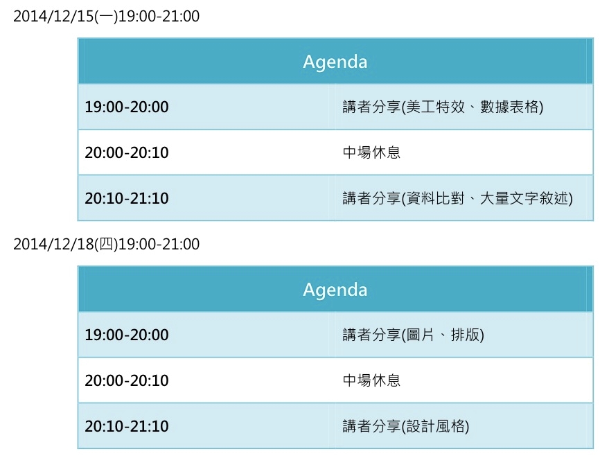 時間:12/15 19:00-2100 ; 12/18 19:00-21:00 (分開報名)