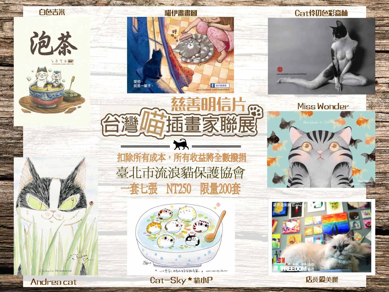 另外同場特設《台灣喵插畫家展覽》慈善明信片,一套7張,集合全6位插畫家作品及可愛貓店長,只賣NT250,扣除成本,全數撥捐「臺北市流浪貓協會」,既可以寄給朋友祝福聖誕快樂,又可以為寒冬中流落街頭的毛小孩送暖。