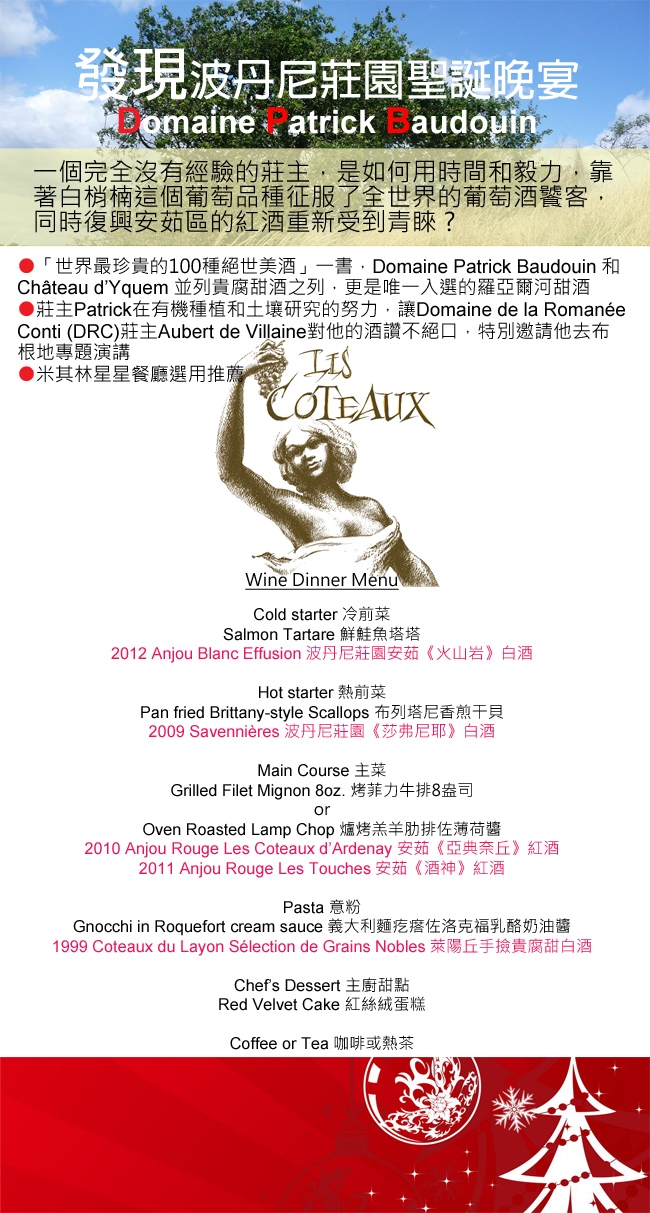 一個完全沒有經驗的莊主,是如何用時間和毅力,靠著白梢楠這個葡萄品種征服了全世界的葡萄酒饕客,同時復興安茹區的紅酒重新受到青睞 ? 今年聖誕就讓我們一起品嚐細心搭配的餐酒美味,透過白酒、紅酒、甜白酒訴說的故事,一起來發現認識來自法國羅亞爾河的有機酒莊 ─波丹尼莊園!