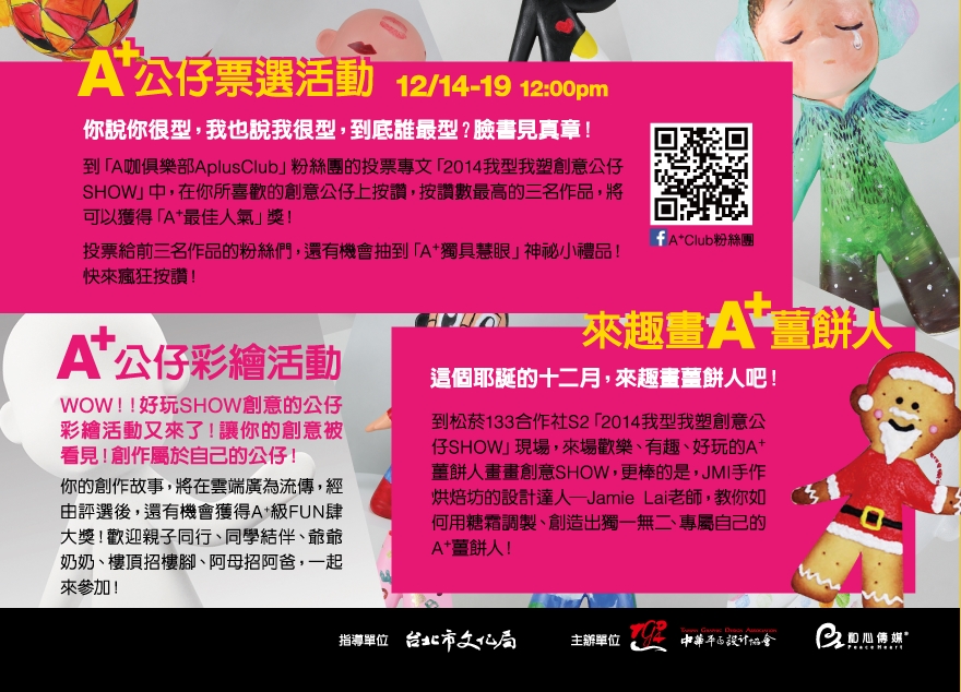 配合此次展覽,A+Club更精心準備了設計界達人座談會、公仔彩繪體驗、創意公仔網路票選、A+薑餅人彩繪教學等活動,期望帶給大家更多樂趣!